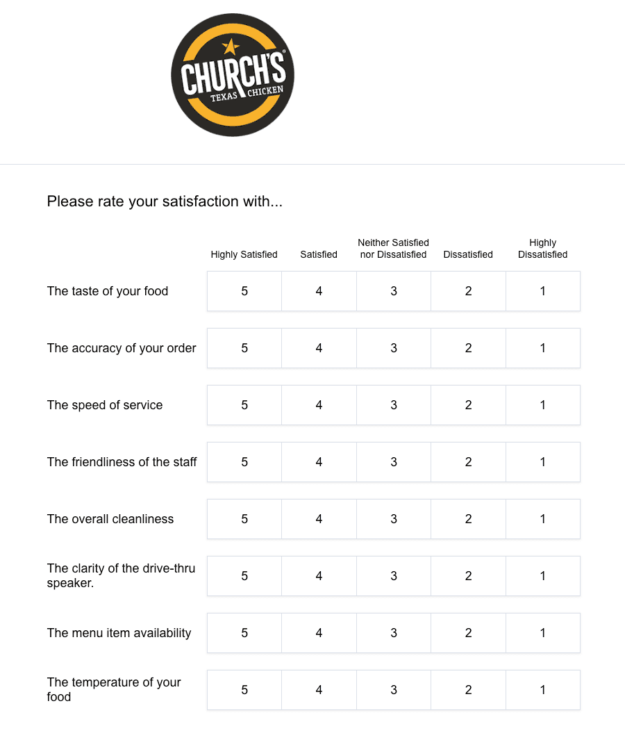 These will cover things like food quality, service, cleanliness, and overall satisfaction. It’s all multiple choice—nothing tricky.